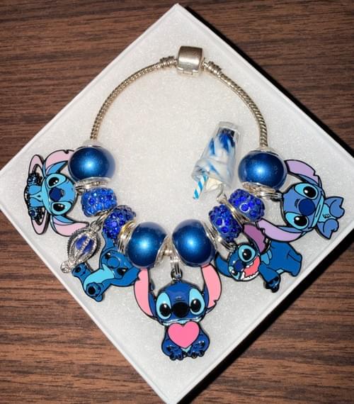 A custom blue and silver Stitch charm bracelet made for little girls