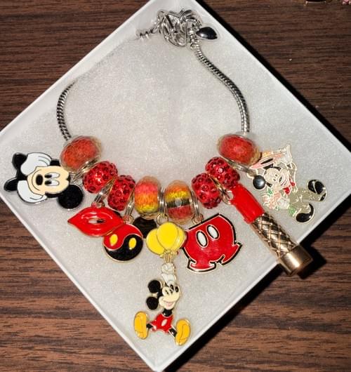A custom red and silver Mickey Mouse charm bracelet made for women