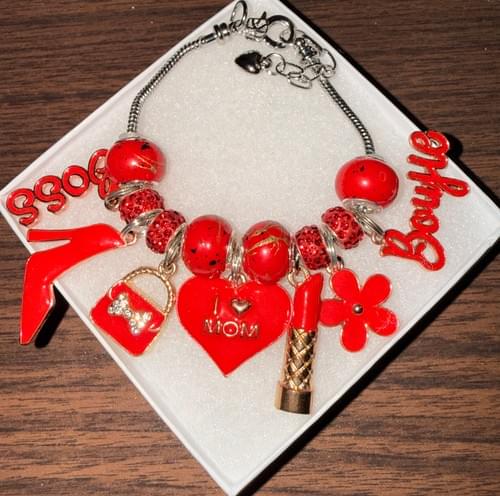 A custom "I Love Mom" red and silver charm bracelet made for women. This bracelet can be a gift for "Mother's Day"