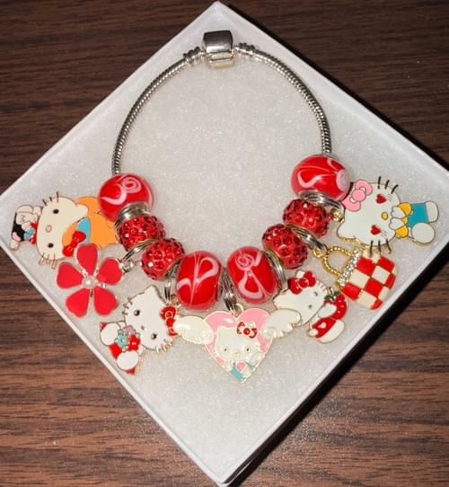 A custom red, white, and silver hello kitty charm bracelet made for little girls