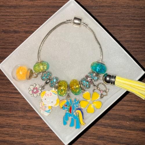 A custom silver, blue, and yellow unicorn charm bracelet made for little girls